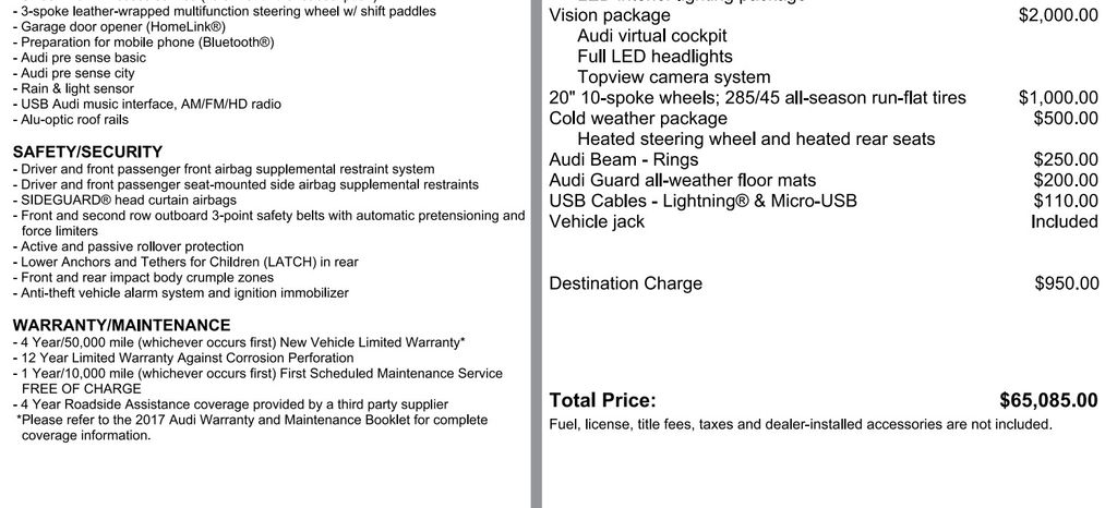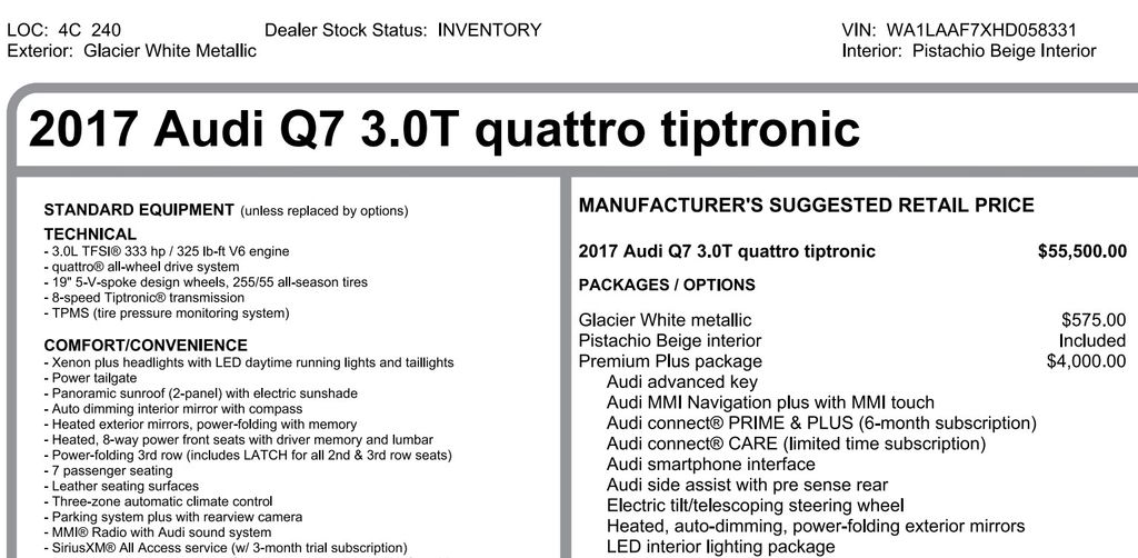 Overall I have been pleased with my Q7, but I would suggest that any potential buyer invests in time-consuming due diligence to truly understand what is necessary for the maintenance of a performance vehicle. I experienced loud brake squeaking around 15,000 miles and was told that I would most likely need to replace in the span of a few months. At 20,000 miles I have been advised that my tires and brakes need to be replaced. This is very common amongst Audi and the Q7. It is a critical missing piece to truly understand the cost of ownership and I think it is important for the consumer to know. Other than that, the Q7 fits my needs offering a usable third row without the large size. It is somewhat generic interior is unimpressive. The technology within is fun, and like most new things, can be glitchy at times. Overall it is reliable. - 5.0
