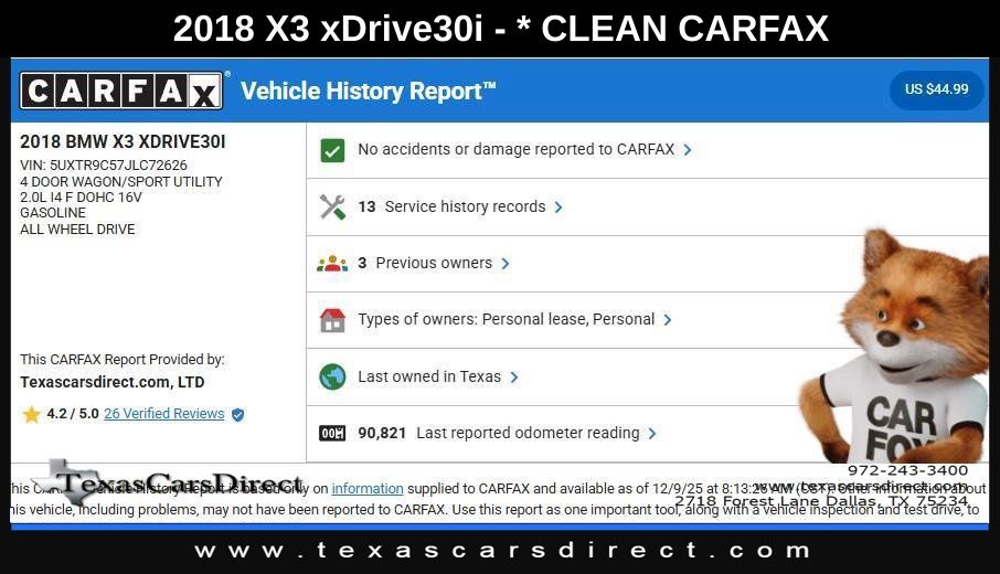 2018 BMW X3 xDrive30i CLEAN CARFAX/HTD LEATHER/NAV/PANO-$8K OP