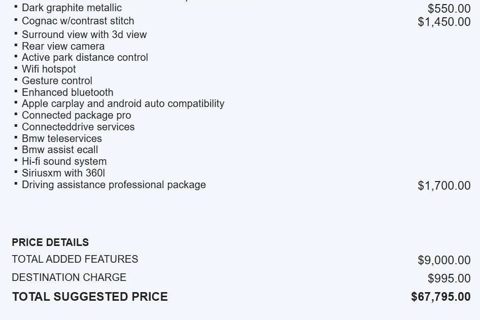 I absolutely love my car. It is quiet, handles extremely well, and is so gratifying to drive. I was recently driving on an interstate where semis do not look for other drivers. The semi almost drove into a car who swerved into the lane I was about to merge in, I had to slam my breaks and the car reacted immediately, avoiding a collision. The blind spot assist is wonderful and makes me feel more safe. The rear view camera is crisp and clear and provides accurate guides. The vehicle also detects your surroundings and warns you when you are too close to curbs when parking. The break hold option is very necessary and helpful in the suburbs. I LOVE the panoramic sunroof, it feels so open. The driver seats has great adjustments, I have the lumber support, and it works wonders for my body. I usually don't like driving but I love driving this car. I test drove other cars, including Mercedes, and the layout of the BMW is so much better inside and drives even better. I also drove a brand new Volskwagen Tiguan and it does not compare to the drive of the BMW. I also test drove a 2020 BMW x1 and 2021 x2, and the 2019 BMW x3 is so well equipped and sleeker than these. - 5.0