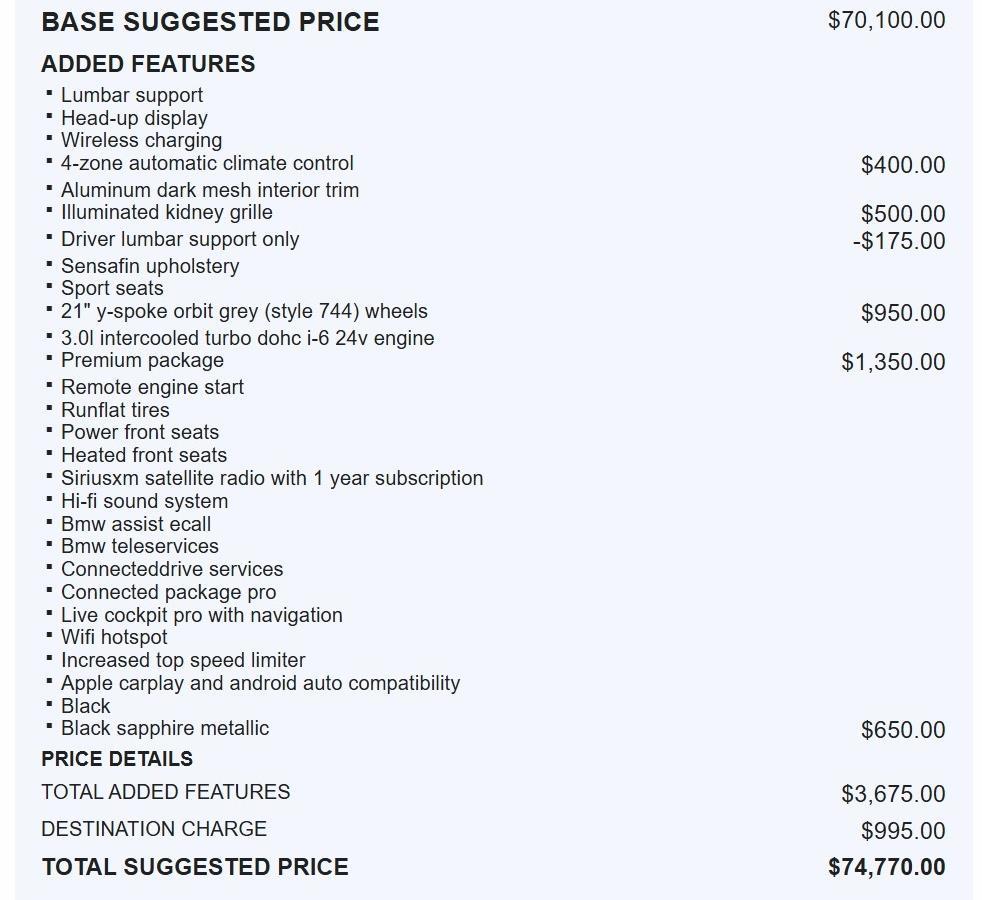 WHEELS: 21 Y-SPOKE ORBIT GREY (STYLE 744), BLACK SAPPHIRE METALLIC, SPORT SEATS, BLACK, SENSAFIN UPHOLSTERY, ALUMINUM DARK MESH INTERIOR TRIM, PREMIUM PACKAGE, ILLUMINATED KIDNEY GRILLE, 4-ZONE AUTOMATIC CLIMATE CONTROL, WIRELESS CHARGING, DRIVER LUMBAR SUPPORT ONLY