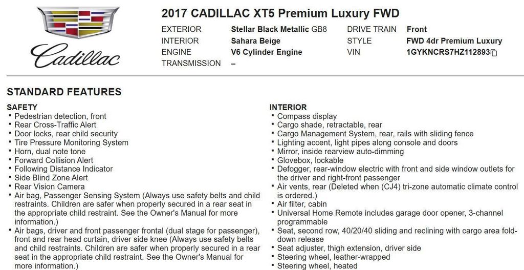 This 2017 Cadillac XT5 Premium Luxury, has Stellar Black Metallic exterior and Sahara Beige interior color. 115,150 miles. Stock Number 112893. You can connect with us by calling 972-243-3400.