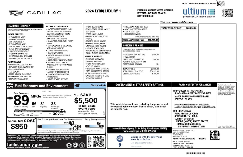 EMISSIONS, FEDERAL REQUIREMENTS, PROPULSION, ELECTRIC, AWD, ENGINE, NONE, DUAL LEVEL CHARGE CORD, 120V/1.4 KW AND 240V/7.7 KW CAPABILITY, TRANSMISSION, NONE, WHEELS, 20 SPLIT 6-SPOKE ALLOY, TIRES, 265/50R20 ALL-SEASON SELF-SEALING, ARGENT SILVER METALLIC, SEATS, FRONT BUCKET, SKY COOL GRAY WITH SANTORINI BLUE ACCENTS, INTELUXE SEAT TRIM WITH PERFORATED INSERTS, BATTERY PACK ORIGIN, LICENSE PLATE BRACKET, FRONT, TRAILERING PROVISIONS, HITCH GUIDANCE, TRAILERING ASSIST GUIDELINE, HITCH VIEW, FOLLOWING DISTANCE INDICATOR