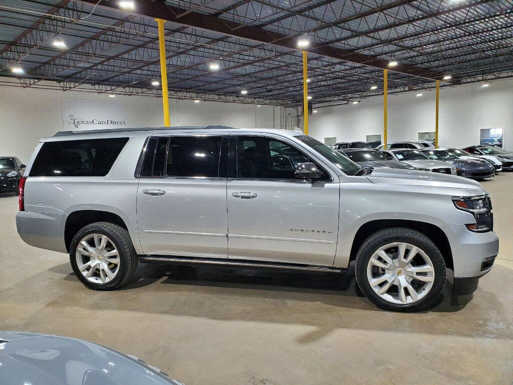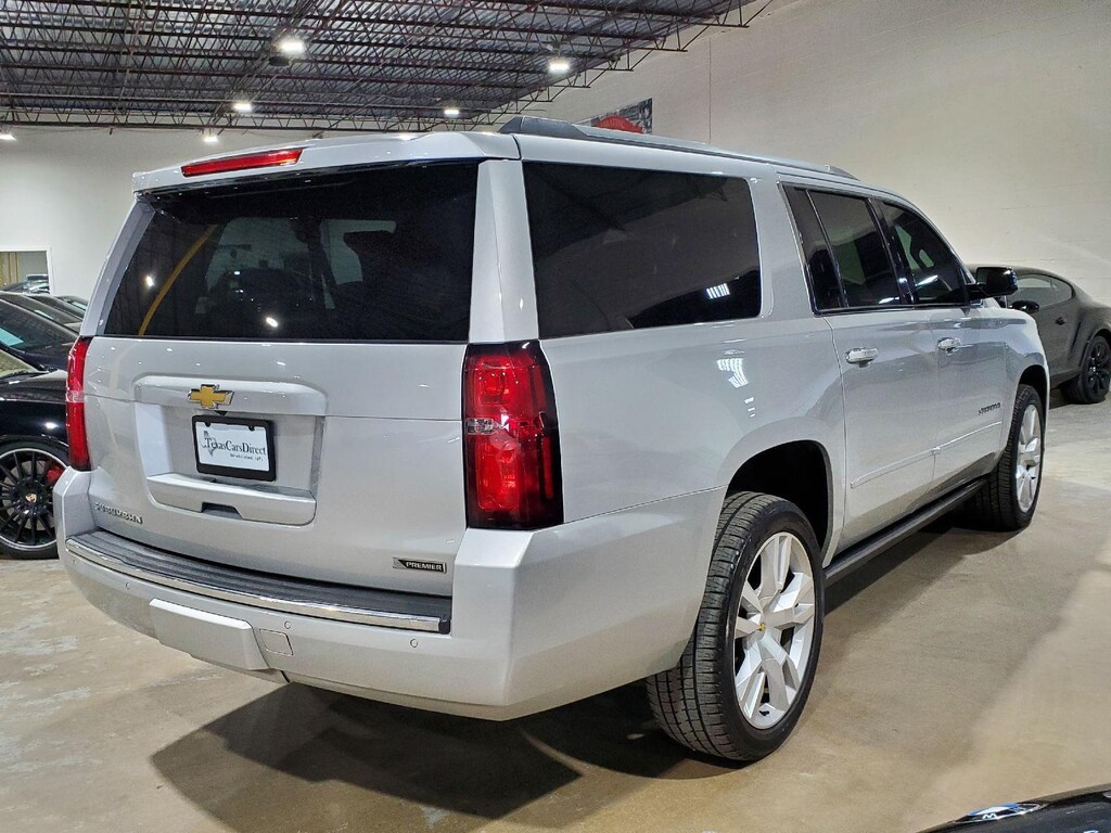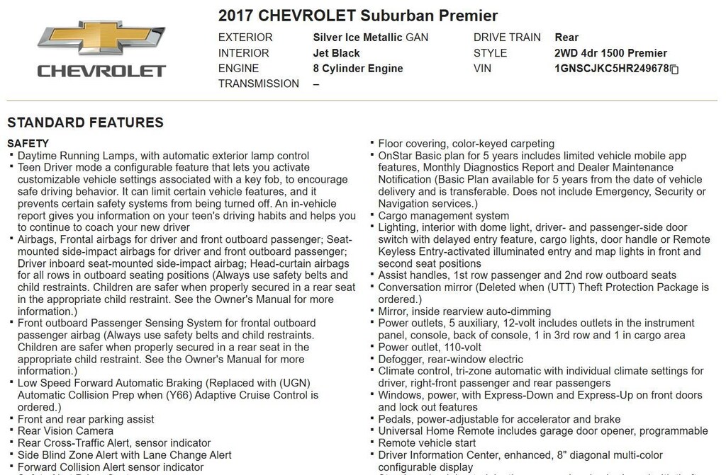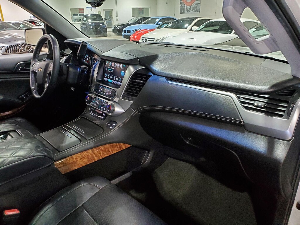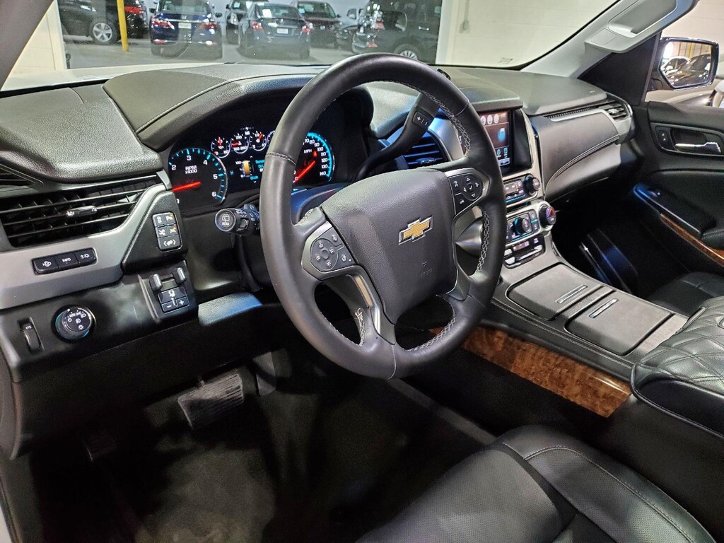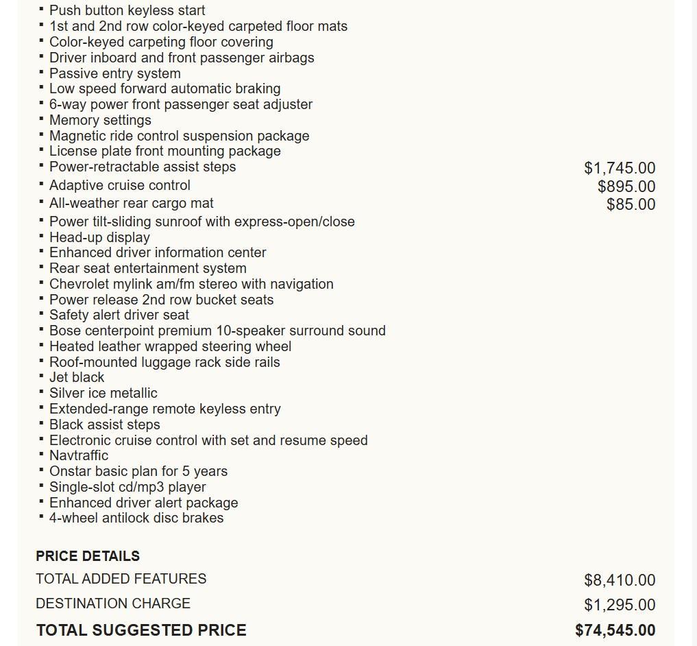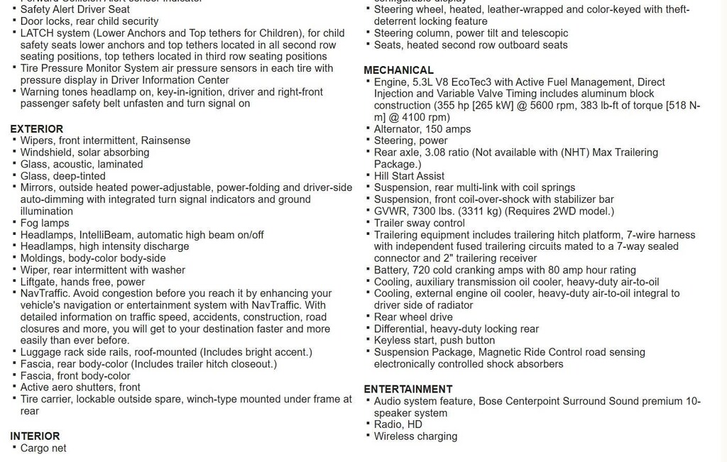 EMISSIONS, FEDERAL REQUIREMENTS, ENGINE, 5.3L V8 ECOTEC3 WITH ACTIVE FUEL MANAGEMENT, DIRECT INJECTION AND VARIABLE VALVE TIMING, TRANSMISSION, 6-SPEED AUTOMATIC, ELECTRONICALLY CONTROLLED, REAR AXLE, 3.42 RATIO, WHEELS, 22 X 9 (55.9 CM X 22.9 CM) 6-SPOKE CHROME MULTI-FEATURED DESIGN, TIRES, P285/45R22 ALL-SEASON BLACKWALL, PAINT SCHEME, SOLID APPLICATION, SILVER ICE METALLIC, SEATS, FRONT BUCKET WITH PERFORATED LEATHER-APPOINTED HEATED AND VENTED SEAT CUSHIONS, JET BLACK, PERFORATED LEATHER-APPOINTED SEAT TRIM, AUDIO SYSTEM, CHEVROLET MYLINK RADIO WITH NAVIGATION AND 8 DIAGONAL COLOR TOUCH-SCREEN, SUN, ENTERTAINMENT AND DESTINATIONS PACKAGE, MAX TRAILERING PACKAGE, TRAILER BRAKE CONTROLLER, INTEGRATED, SUNROOF, POWER, TILT-SLIDING, ASSIST STEPS, POWER-RETRACTABLE, LICENSE PLATE FRONT MOUNTING PACKAGE, ENTERTAINMENT SYSTEM, REAR SEAT, BLU-RAY/DVD, DVD SCREEN, THIRD ROW, LPO, REAR CARGO MAT, ALL-WEATHER, HEAD-UP DISPLAY, INCLUDES DIGITAL MULTI-FUNCTION READOUTS, ADAPTIVE CRUISE CONTROL, BRAKES, 4-WHEEL ANTILOCK, 4-WHEEL DISC, VAC POWER, AUTOMATIC COLLISION PREPARATION, INTELLIGENT BRAKE ASSIST - COLLISION AVOIDANCE BRAKING