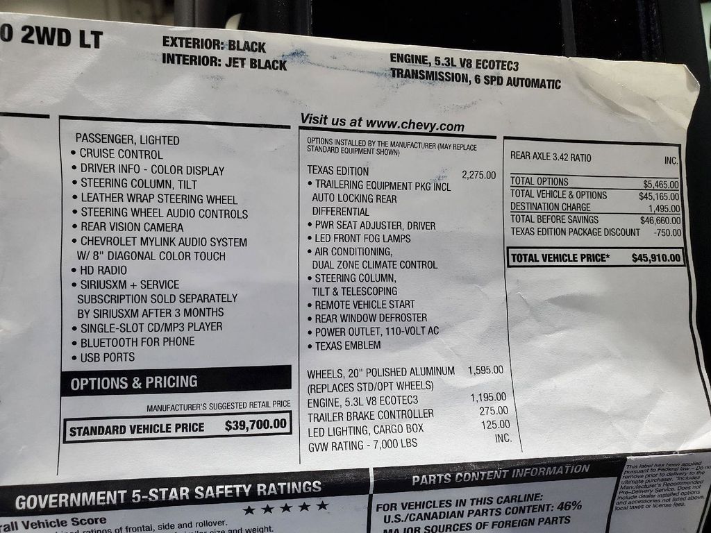 EMISSIONS, FEDERAL REQUIREMENTS, ENGINE, 5.3L ECOTEC3 V8 WITH ACTIVE FUEL MANAGEMENT, DIRECT INJECTION AND VARIABLE VALVE TIMING, TRANSMISSION, 6-SPEED AUTOMATIC, ELECTRONICALLY CONTROLLED, GVWR, 7000 LBS. (3175 KG), REAR AXLE, 3.42 RATIO, WHEELS, 20" X 9" (50.8 CM X 22.9 CM) POLISHED-ALUMINUM, TIRES, P275/55R20 ALL-SEASON, BLACKWALL, PAINT, SOLID, BLACK, SEATS, FRONT 40/20/40 SPLIT-BENCH, 3-PASSENGER, AVAILABLE IN CLOTH OR LEATHER, JET BLACK, CLOTH SEAT TRIM, AUDIO SYSTEM, CHEVROLET MYLINK RADIO WITH 8" DIAGONAL COLOR TOUCH-SCREEN, AM/FM STEREO, TEXAS EDITION, DIFFERENTIAL, HEAVY-DUTY LOCKING REAR, COOLING, AUXILIARY EXTERNAL TRANSMISSION OIL COOLER, TRAILER BRAKE CONTROLLER, INTEGRATED, TIRE, SPARE P265/70R17 ALL-SEASON, BLACKWALL, LED LIGHTING, CARGO BOX, LICENSE PLATE KIT, FRONT, STEERING COLUMN, MANUAL TILT AND TELESCOPING, REMOTE VEHICLE STARTER SYSTEM, THEFT-DETERRENT SYSTEM, UNAUTHORIZED ENTRY, AIR CONDITIONING, DUAL-ZONE AUTOMATIC CLIMATE CONTROL, DEFOGGER, REAR-WINDOW ELECTRIC, POWER OUTLET, 110-VOLT AC