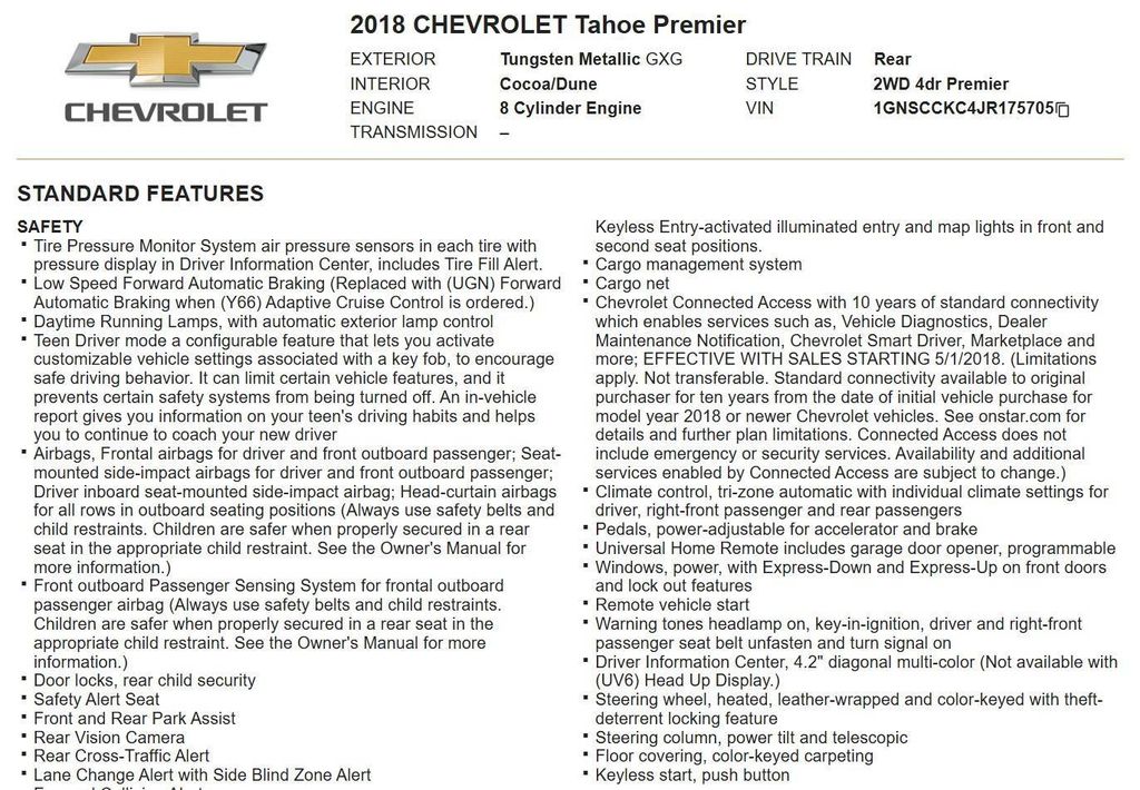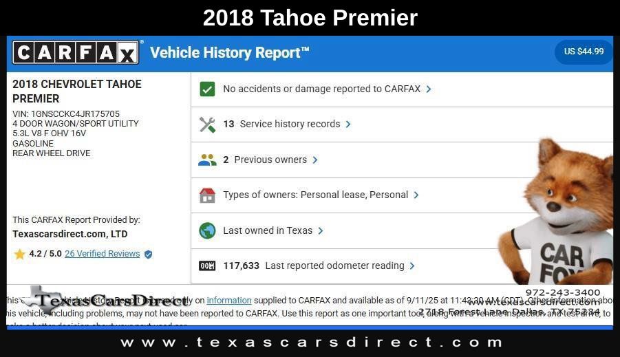 This 2018 Chevrolet Tahoe Premier, has Tungsten Metallic exterior and Cocoa/Dune interior color. 135,595 miles. Stock Number 175705. You can connect with us by calling 972-243-3400.