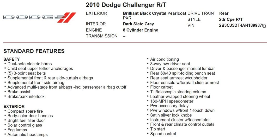 2010 Dodge Challenger R/T 5.7L Hemi V8/Automatic