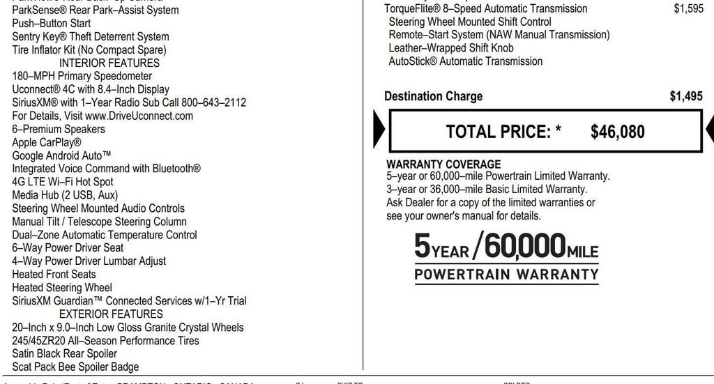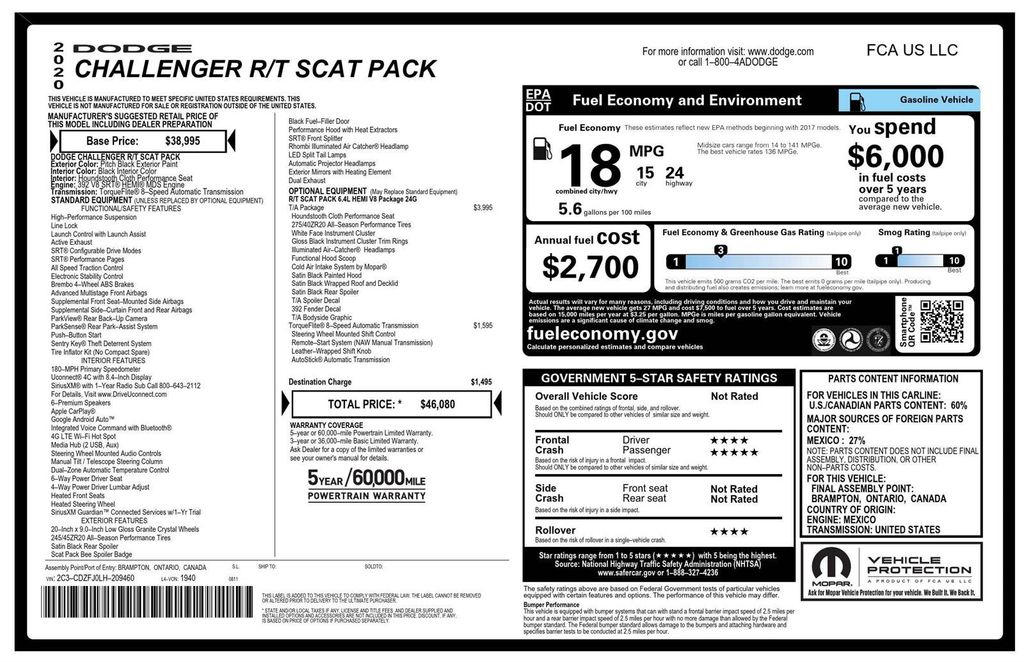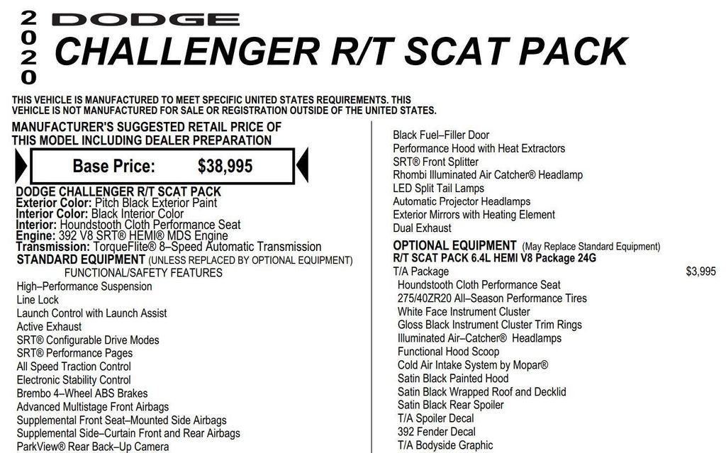 ENGINE: 6.4L V8 SRT HEMI MDS, TRANSMISSION: 8-SPEED AUTOMATIC (8HP70), QUICK ORDER PACKAGE 24G R/T SCAT PACK, WHEELS: 20" X 9.5" FORGED/PAINTED ALUMINUM, TIRES: 275/40ZR20 AS PERFORMANCE, PITCH BLACK CLEARCOAT, BLACK, HOUNDSTOOTH CLOTH PERFORMANCE SEATS, T/A PACKAGE, LOCKING LUG NUTS