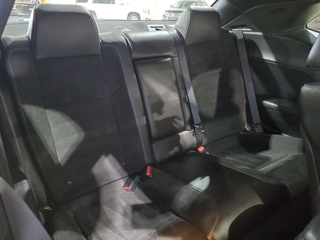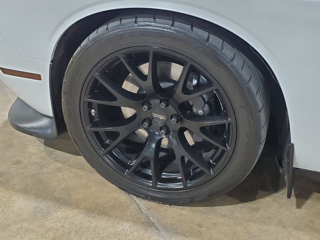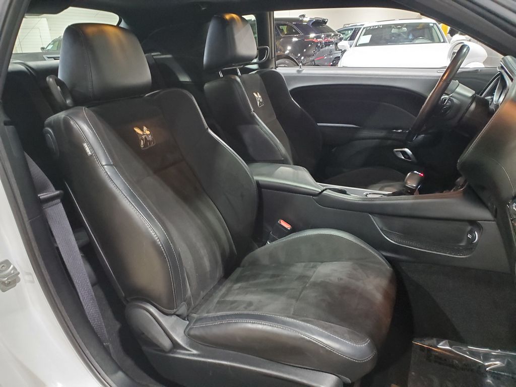 Boasting a striking white exterior, this Challenger R/T Scat Pack stands out with its bold and aggressive styling. The 20-inch granite crystal wheels, dual exhaust tips, and rear spoiler exude a commanding presence, while the spacious cabin offers comfort and style with its Scat Pack logo houndstooth seats and ambient lighting.