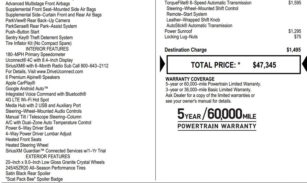 Elevating the driving experience, this Challenger R/T Scat Pack comes equipped with a Plus Package, including a heated steering wheel, power tilt/telescope steering column, and premium-stitched dashboard. The Driver Convenience Group adds blind spot monitoring, high-intensity discharge headlamps, and power-folding mirrors for enhanced safety and convenience.