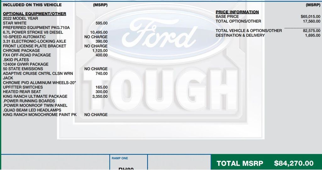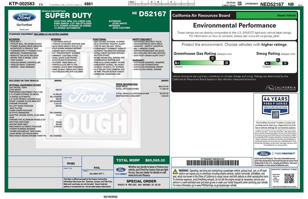 ENGINE: 6.7L 4V OHV POWER STROKE V8 TURBO DIESEL B20, ORDER CODE 710A, ELECTRONIC-LOCKING W/3.31 AXLE RATIO, KING RANCH ULTIMATE PACKAGE, FX4 OFF-ROAD PACKAGE, HEATED REAR SEATS, ADAPTIVE CRUISE CONTROL & COLLISION WARNING, UPFITTER SWITCHES (6)