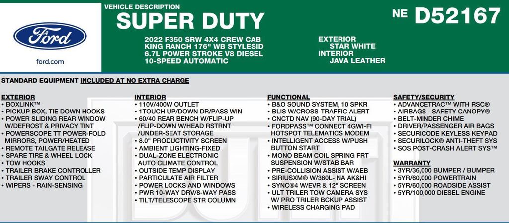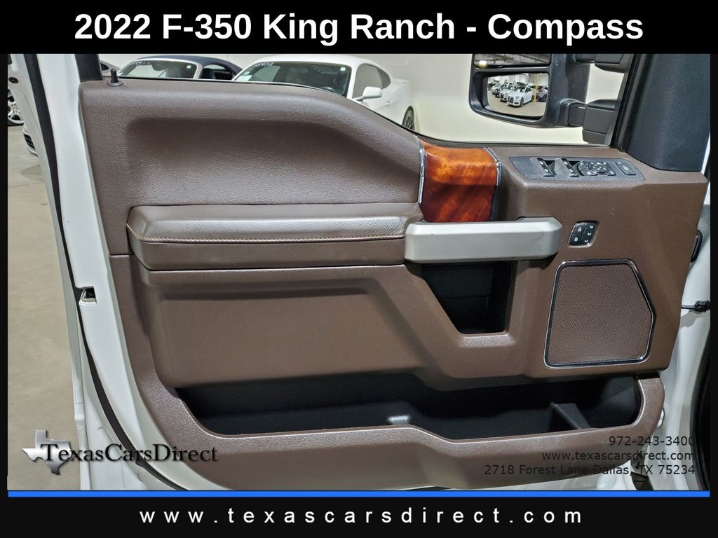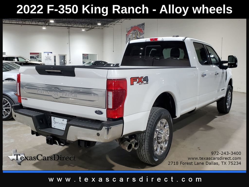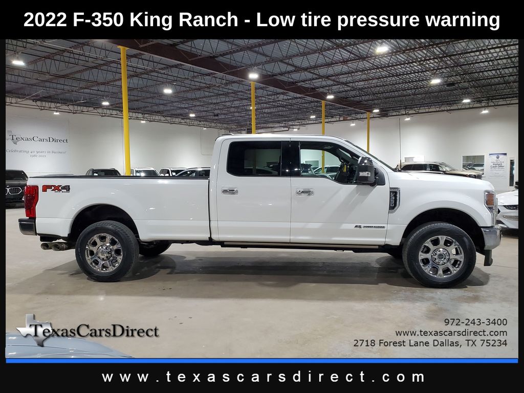 This 2022 Ford Super Duty F-350 SRW King Ranch, has Star White Metallic Tri-Coat exterior and Java interior color. 53,488 miles. Stock Number D52167. You can connect with us by calling 972-243-3400.