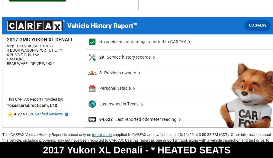 Step into the world of luxury and performance with this stunning 2017 GMC Yukon XL Denali 4WD. This exceptional SUV boasts a clean CARFAX history, ensuring you can drive with confidence. Packed with a powerful EcoTec3 6.2L V8 engine and 8-speed automatic transmission, this Yukon XL Denali delivers exceptional capability and efficiency, with an impressive 14 city/20 highway MPG.