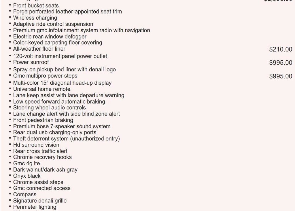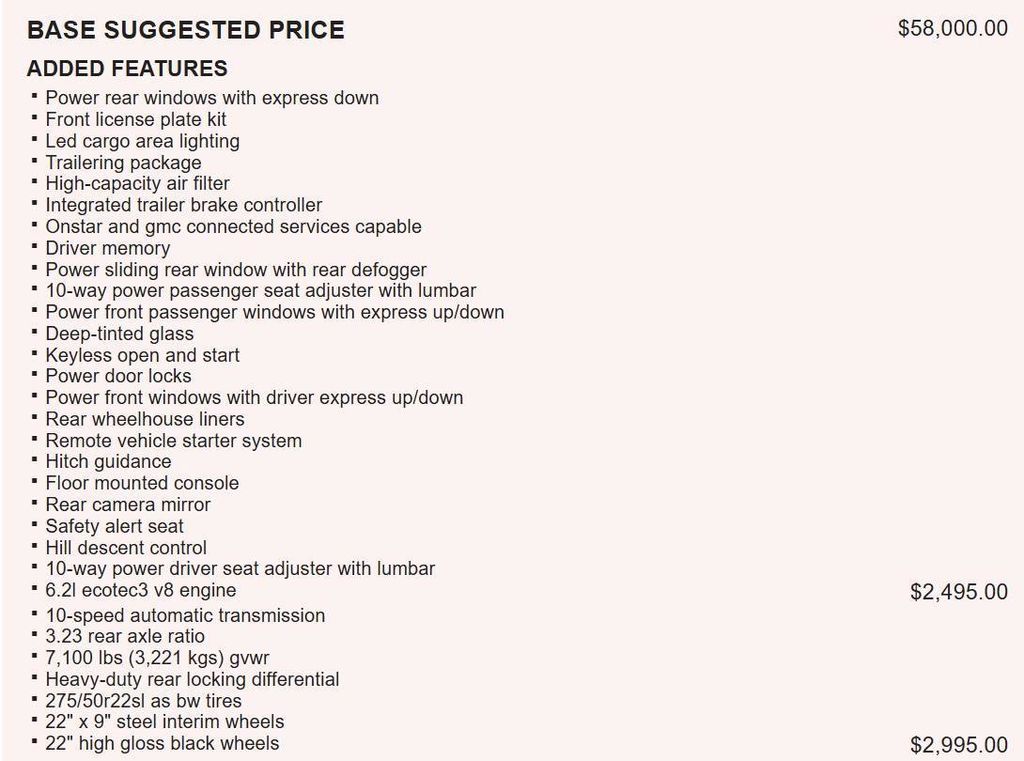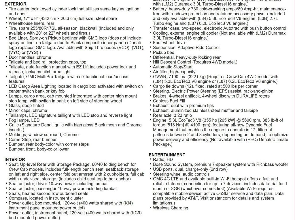 EMISSIONS, FEDERAL REQUIREMENTS, ENGINE, 6.2L ECOTEC3 V8, TRANSMISSION, 10-SPEED AUTOMATIC, ELECTRONICALLY CONTROLLED, GVWR, 7100 LBS. (3221 KG), REAR AXLE, 3.23 RATIO, WHEELS, 22" TRANSIT STEEL WHEELS FOR LPO 22" WHEELS AND TIRES, TIRES, 275/50R22SL ALL-SEASON, BLACKWALL, ONYX BLACK, SEATS, FRONT BUCKET, DARK WALNUT/DARK ASH GREY, FORGE PERFORATED LEATHER-APPOINTED SEAT TRIM, AUDIO SYSTEM, PREMIUM GMC INFOTAINMENT SYSTEM WITH NAVIGATION AND 8" DIAGONAL COLOR TOUCH-SCREEN, INCLUDES MULTI-TOUCH DISPLAY, AM/FM STEREO, TECHNOLOGY PACKAGE, DRIVER ALERT PACKAGE II, LPO, 22" (55.9CM) HIGH GLOSS BLACK WHEELS, SUNROOF, POWER, GMC MULTIPRO POWER STEPS, REARWARD ARTICULATING, INTELLIBEAM, AUTOMATIC HIGH BEAM ON/OFF, LICENSE PLATE KIT, FRONT, LPO, ALL-WEATHER FLOOR LINER, 1ST AND 2ND ROWS, MULTI-COLOR 15" DIAGONAL HEAD-UP DISPLAY, REAR CAMERA MIRROR, INSIDE REARVIEW AUTO-DIMMING, LOW SPEED FORWARD AUTOMATIC BRAKING, FRONT PEDESTRIAN BRAKING, HD SURROUND VISION, FOLLOWING DISTANCE INDICATOR, FORWARD COLLISION ALERT, LANE KEEP ASSIST, CUSTOMER DIALOGUE NETWORK