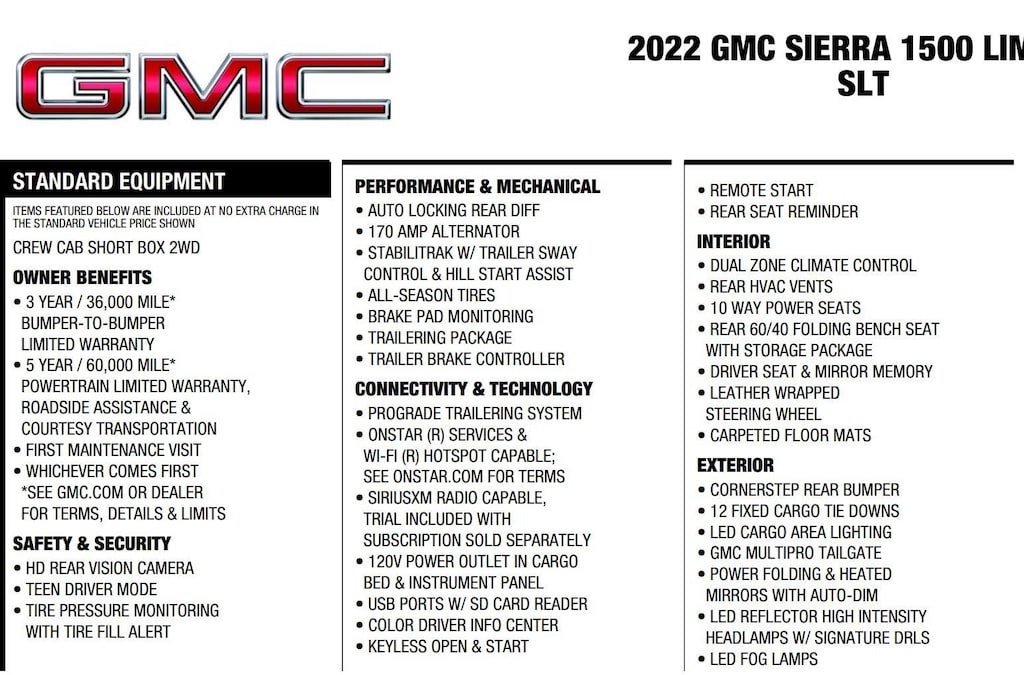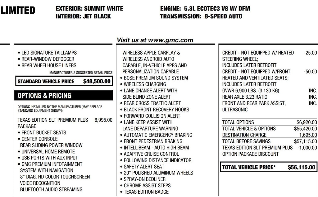 EMISSIONS, FEDERAL REQUIREMENTS, ENGINE, 5.3L ECOTEC3 V8, TRANSMISSION, 8-SPEED AUTOMATIC, ELECTRONICALLY CONTROLLED, GVWR, 6900 LBS. (3130 KG), REAR AXLE, 3.23 RATIO, WHEELS, 20 X 9 (50.8 CM X 22.9 CM) POLISHED ALUMINUM, TIRES, 275/60R20 ALL-SEASON, BLACKWALL, TIRE, SPARE 255/80R17SL ALL-SEASON, BLACKWALL, SUMMIT WHITE, SEATS, FRONT BUCKET, JET BLACK, PERFORATED LEATHER-APPOINTED FRONT OUTBOARD SEAT TRIM, AUDIO SYSTEM, PREMIUM GMC INFOTAINMENT SYSTEM WITH NAVIGATION AND 8 DIAGONAL COLOR TOUCH-SCREEN, INCLUDES MULTI-TOUCH DISPLAY, AM/FM STEREO, TEXAS EDITION SLT PREMIUM PLUS PACKAGE, SLT CONVENIENCE PACKAGE, SLT PREFERRED PACKAGE, DRIVER ALERT PACKAGE II, DRIVER ALERT PACKAGE I, RECOVERY HOOKS, FRONT, FRAME-MOUNTED, BLACK, ASSIST STEPS, CHROME WHEEL TO WHEEL, INTELLIBEAM, AUTOMATIC HIGH BEAM ON/OFF, WINDOW, POWER, REAR SLIDING WITH REAR DEFOGGER, LICENSE PLATE KIT, FRONT, BED LINER, SPRAY-ON, BOSE SOUND SYSTEM, PREMIUM 7-SPEAKER SYSTEM, SEATS, VENTILATED DRIVER AND FRONT PASSENGER, CENTER CONSOLE, FLOOR-MOUNTED, UNIVERSAL HOME REMOTE, ADAPTIVE CRUISE CONTROL, WIRELESS CHARGING, USB PORTS, 2 (FIRST ROW) LOCATED ON INSTRUMENT PANEL, AUTOMATIC EMERGENCY BRAKING, FRONT PEDESTRIAN BRAKING, FRONT AND REAR PARK ASSIST, ULTRASONIC, FOLLOWING DISTANCE INDICATOR, FORWARD COLLISION ALERT, LANE KEEP ASSIST, LANE CHANGE ALERT, REAR CROSS TRAFFIC ALERT, SAFETY ALERT SEAT, NOT EQUIPPED WITH HEATED OR VENTILATED FRONT SEATS, NOT EQUIPPED WITH HEATED STEERING WHEEL