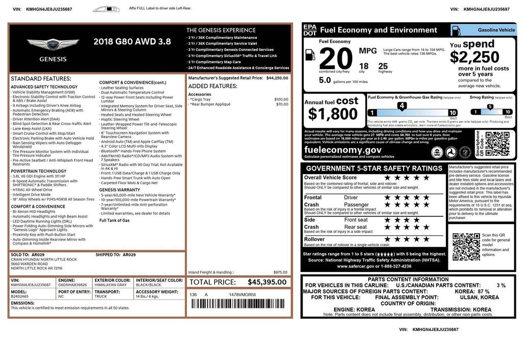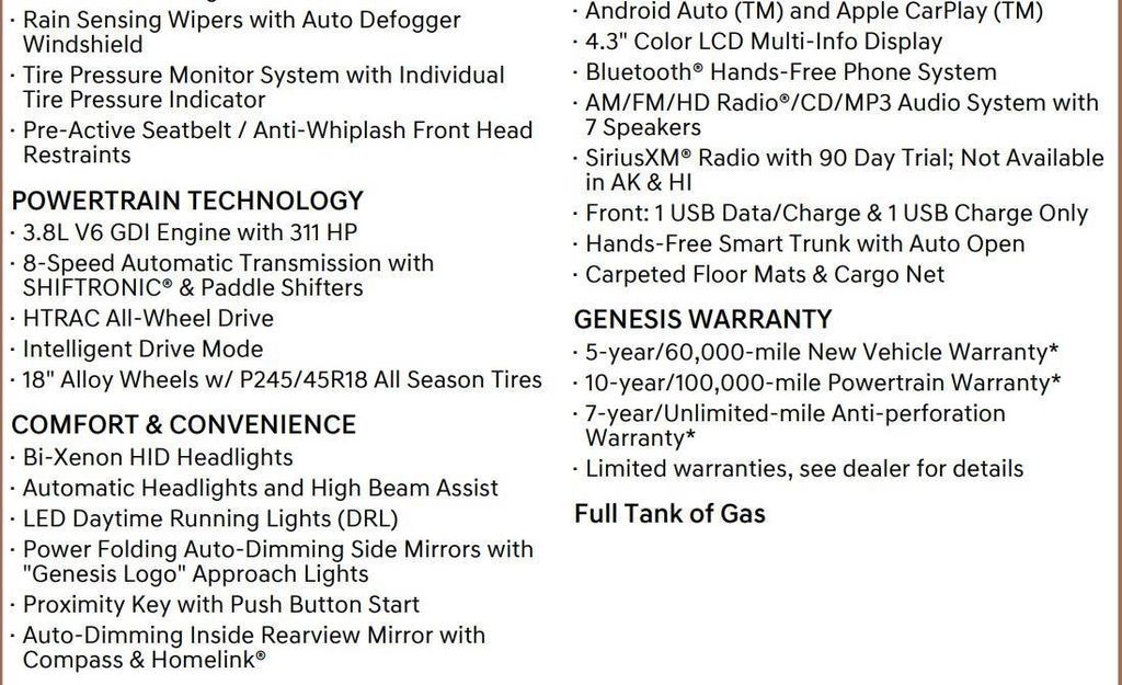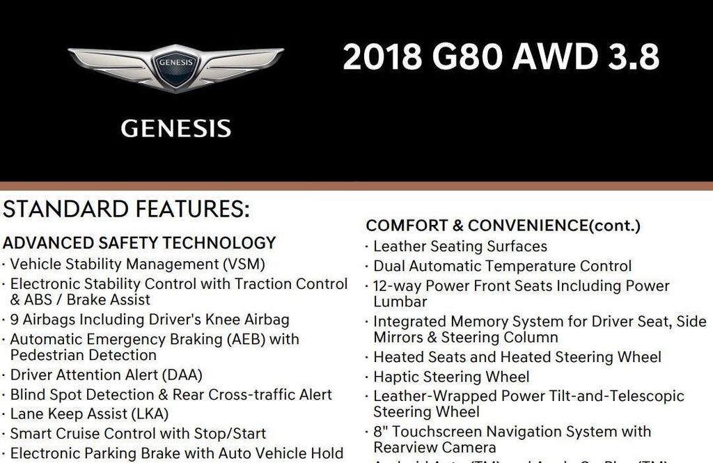 Boasting a powerful 3.8L V6 engine and all-wheel drive, this Genesis G80 delivers a thrilling and confident ride, while the 8-speed automatic transmission with SHIFTRONIC ensures seamless acceleration and responsive handling. With an EPA-estimated 18 MPG in the city and 25 MPG on the highway, this sedan strikes an impressive balance between performance and efficiency.