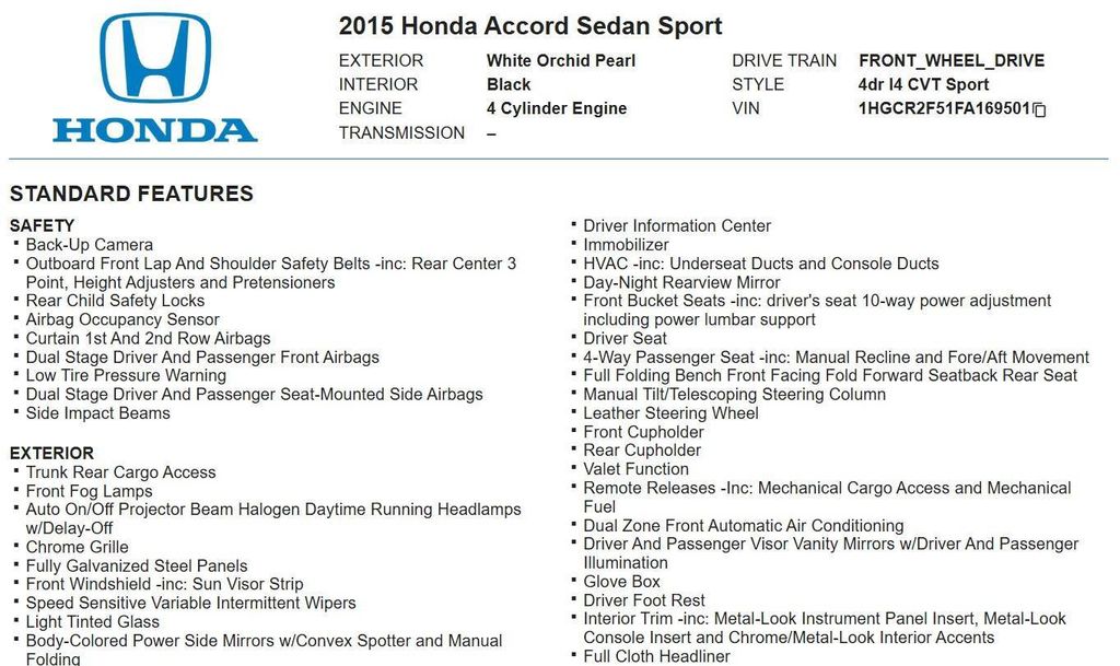 This 2015 Honda Accord Sedan Sport, has White Orchid Pearl exterior and Black interior color. 163,489 miles. Stock Number 169501. You can connect with us by calling 972-243-3400.