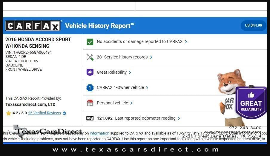 This 2016 Honda Accord Sedan Sport, has White Orchid Pearl exterior and Black interior color. 122,353 miles. Stock Number 066494. You can connect with us by calling 972-243-3400.
