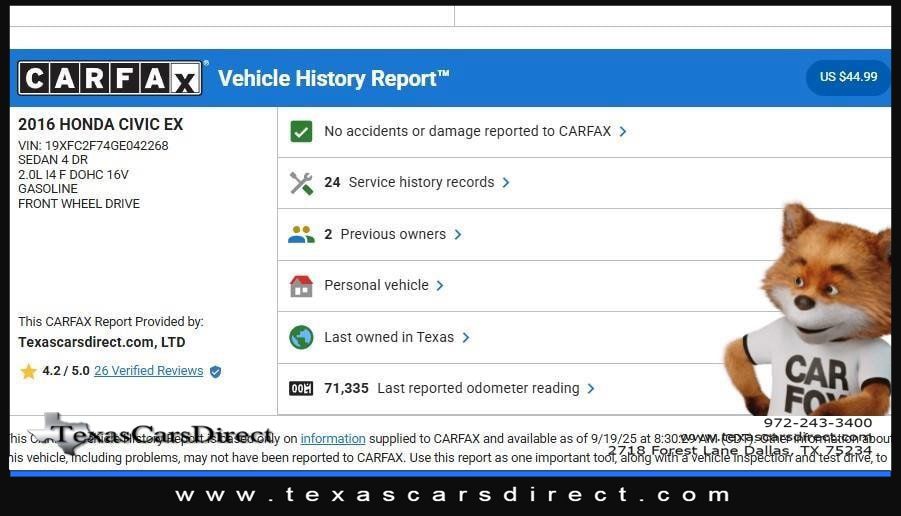 This 2016 Honda Civic Sedan EX, has Modern Steel Metallic exterior and Gray interior color. 71,628 miles. Stock Number 042268. You can connect with us by calling 972-243-3400.