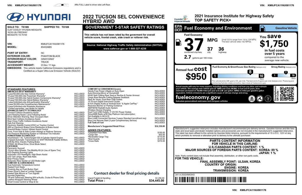 I bought my Hyundai Tucson Hybrid Limited in June of 2021. Which is amazing considering the new car market this summer. I really enjoy the quiet cabin and smooth ride. I'm still finding fun stuff about the vehicle. I was really impressed when I took a last-minute road trip from Vancouver, WA to Phoenix, AZ. The entire trip was amazing, smooth, quite, and comfortable. I really enjoyed the gas mileage and the fact that I didn't have to fill up often. Six (6) full fill-ups for the round trip which was cheaper than one-way flight. I really liked that it wasn't anywhere near overheating even in the long hot desert day. - 5.0