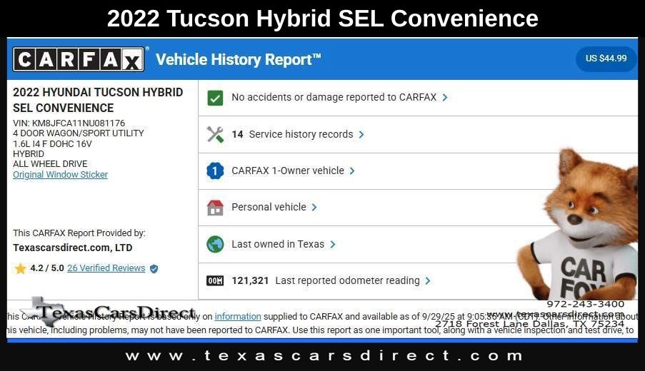 This 2022 Hyundai Tucson Hybrid SEL Convenience, has Phantom Black exterior and Gray interior color. 125,001 miles. Stock Number 081176. You can connect with us by calling 972-243-3400.