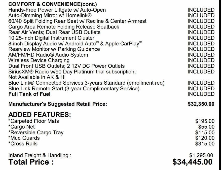 - Tracker system: Blue Link Connected Car Service (3-year complimentary subscription)