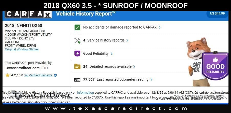 With its impressive list of premium features and the peace of mind of a clean CARFAX report, this 2018 INFINITI QX60 is a remarkable opportunity. Experience the difference of owning a true luxury SUV â" schedule a test drive today and discover the exceptional value this vehicle offers.