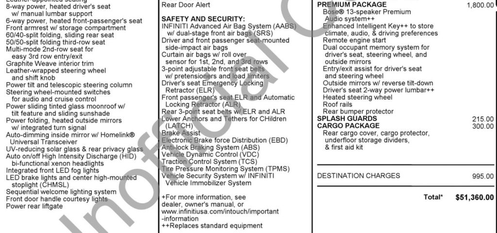 Nice design, good fit as a family car. However the quality is an disappointment. I have not been able to run away from problems since purchase: 1st day after got the car, left back door could not be opened from inside... Drove back to dealer, I was told one component needs to be replaced. The lead time was 4 weeks ...Part shipped after 1.5 weeks after complaining to customer service. Found another problem right after door issue fixed, the rubber line under cargo rack cover came off, drove back to dealer again the day after door issue fixed...Again, a new part needs to be ordered and replaced... Those are not big problems, but very bothering especially when you purchased a brand new car. All the miles I had so far was for going back and forth to the dealership. I am very concerned about Infiniti's quality control. I shifted from BMW to Inifinit because everyone says the quality of Japanese Carhas is good. My experience did not prove that. - 5.0