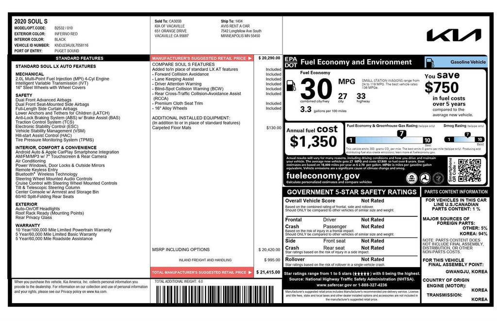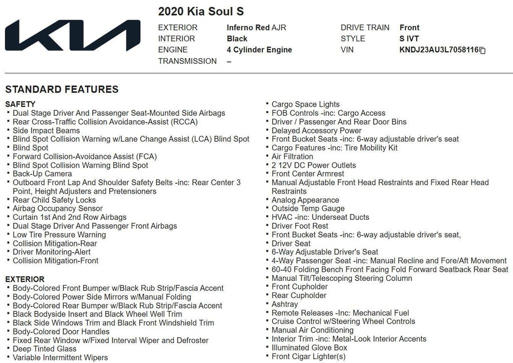 This 2020 Kia Soul S, has Inferno Red exterior and Black interior color. 64,700 miles. Stock Number 058116. You can connect with us by calling 972-243-3400.