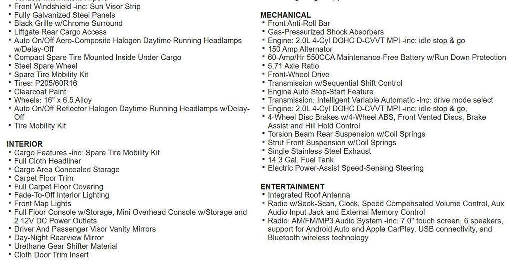 Radio: AM/FM/MP3 Audio System -inc: 7.0" touch screen, 6 speakers, support for Android Auto and Apple CarPlay, USB connectivity, and Bluetooth wireless technology, Blind Spot Collision Warning w/Lane Change Assist (LCA) Blind Spot, Forward Collision-Avoidance Assist (fca), Rear Cross-Traffic Collision Avoidance-Assist (RCCA), Collision Mitigation-Front, Driver Monitoring-Alert, Back-Up Camera