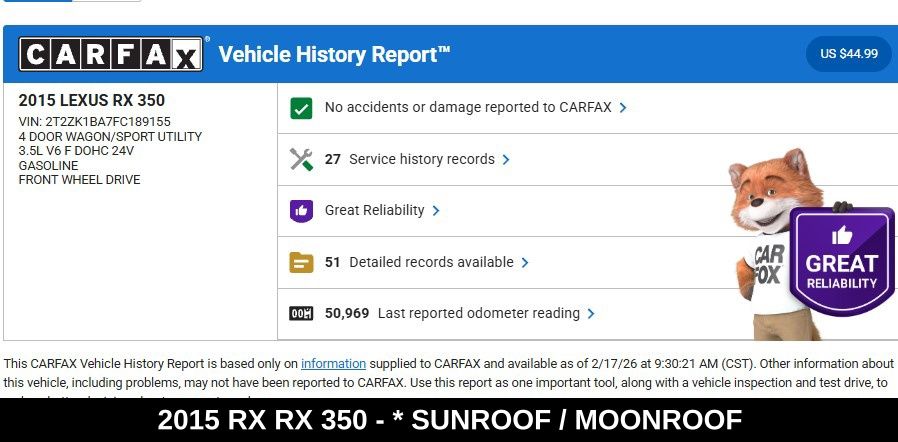 With a clean CARFAX report and over $9,000 in added options, this 2015 Lexus RX 350 represents an exceptional value in the luxury SUV market. Don't miss the opportunity to experience the exceptional craftsmanship and features that make this vehicle a standout choice.