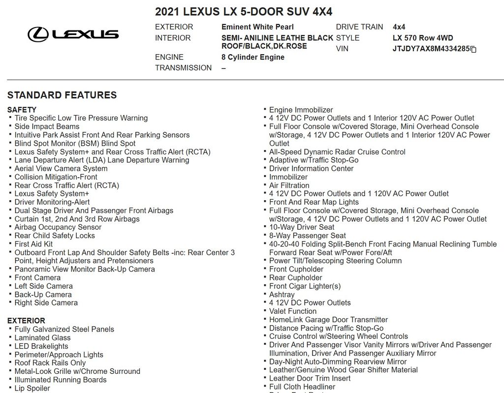 Powered by a robust 5.7L V8 DOHC Dual VVT-i 32V engine mated to an 8-Speed Automatic with Sequential Shift transmission, the LX 570 delivers exceptional performance and capability. With its 4WD system, you'll conquer any terrain with confidence, while the Luxury Package ensures a refined and sophisticated driving experience.