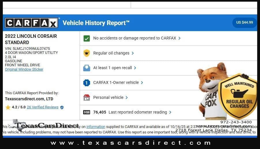 This 2022 Lincoln Corsair Standard, has Infinite Black Metallic Clearcoat exterior and Ebony/Medium Slate interior color. 78,332 miles. Stock Number L07475. You can connect with us by calling 972-243-3400.