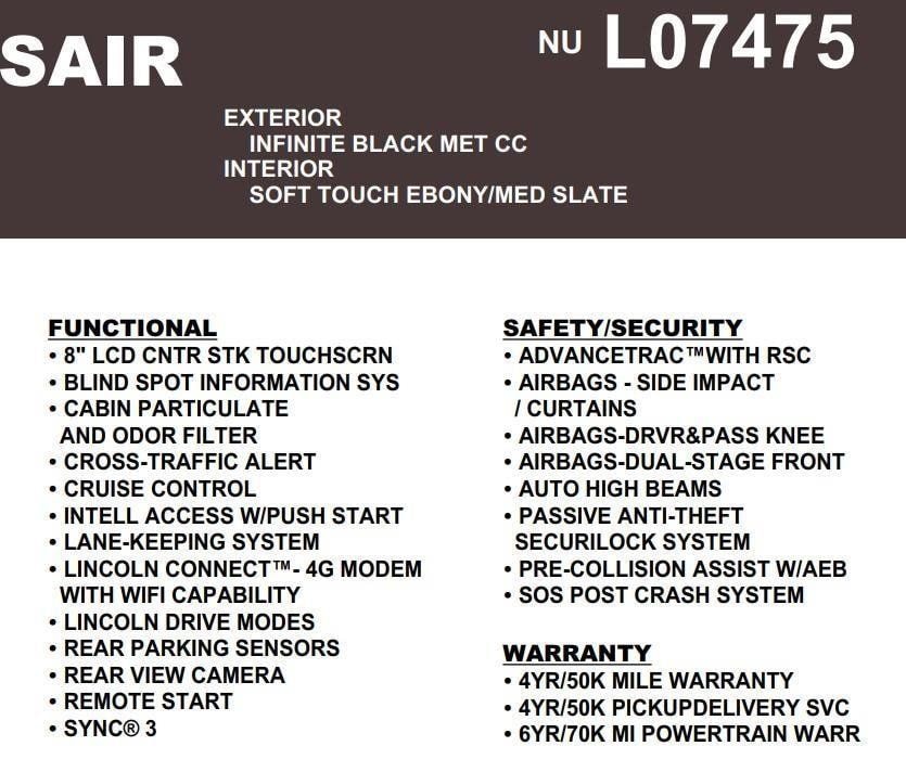 - Forward collision: Lincoln Co-Pilot360 - Pre-Collision Assist with Automatic Emergency Braking (AEB) mitigation