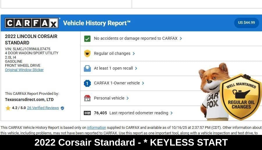 2022 Lincoln Corsair Standard 1-Owner Clean Carfax/Blind Spot/Remote St