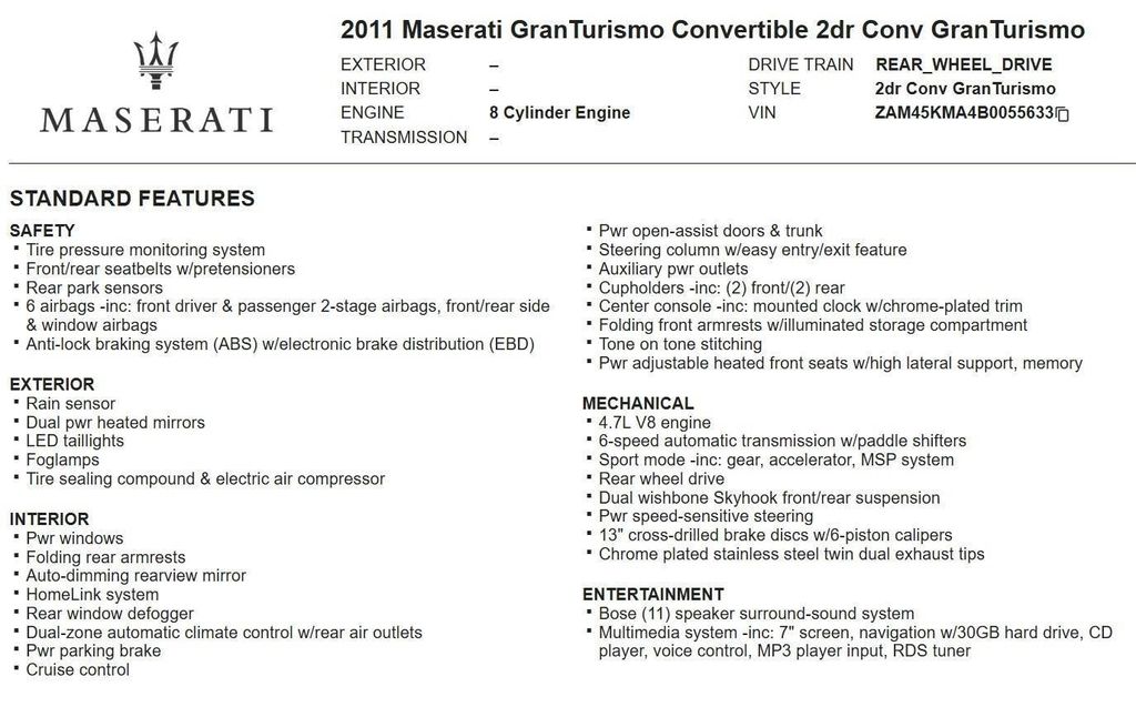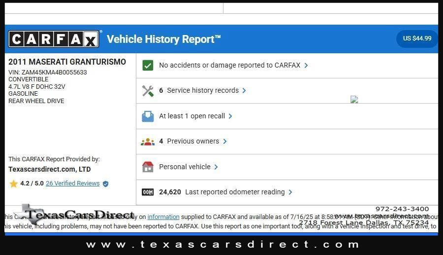 This 2011 Maserati GranTurismo Convertible Base, has Nero Carbonio (Black) exterior and Avorio (Beige) interior color. 26,169 miles. Stock Number 055633. You can connect with us by calling 972-243-3400.