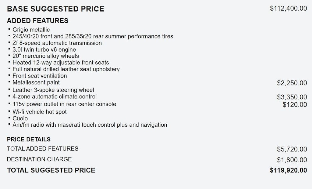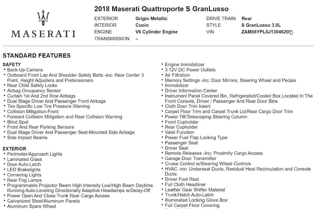 GRIGIO METALLO METALLIC, CUOIO, FULL LEATHER UPHOLSTERY, METALLESCENT PAINT, 4-ZONE AUTOMATIC CLIMATE CONTROL, 115V POWER OUTLET IN REAR CENTER CONSOLE