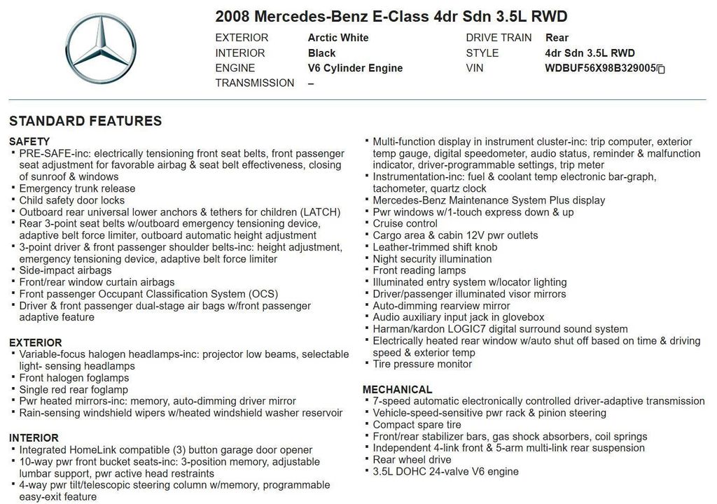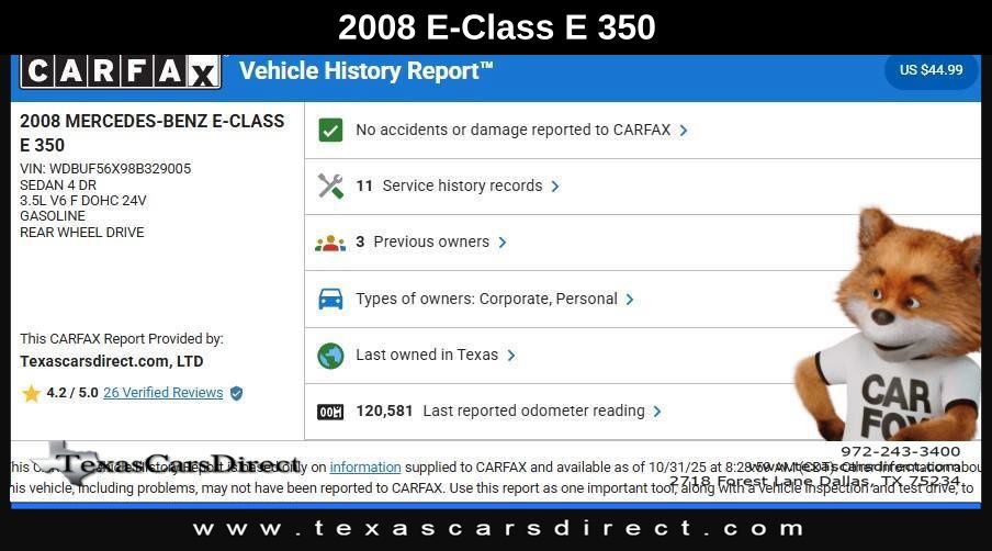 This 2008 Mercedes-Benz E-Class E350 SPORT, has Arctic White exterior and Black interior color. 128,216 miles. Stock Number 329005. You can connect with us by calling 972-243-3400.