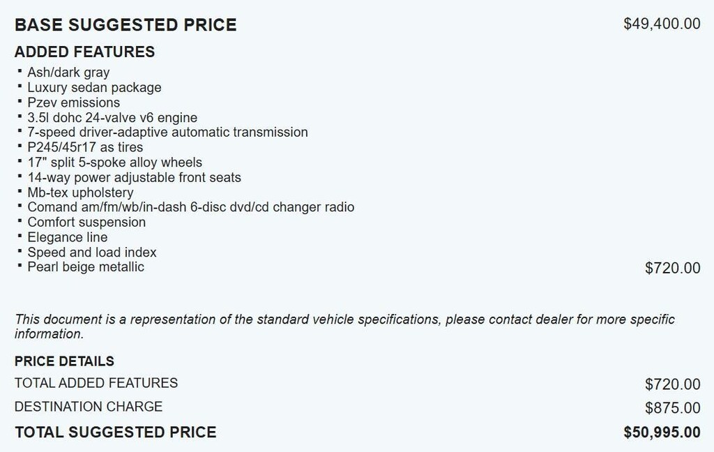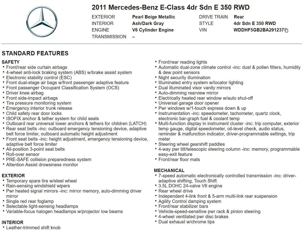 3.5L DOHC 24-valve V6 engine, 17 x 8.0 5 twin-spoke aluminum wheels, Universal garage door opener, ATTENTION ASSIST drowsiness monitor, PRE-SAFE collision preparedness system