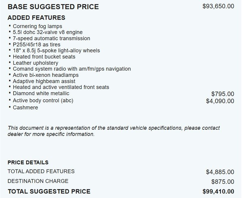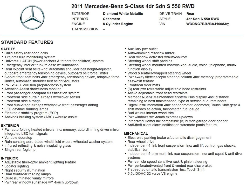This automobile is massive inside with all the creature comforts one could want. It has a tremendous amount of power, handles well and is practically unstoppable in the snow. It is my third S Class Mercedes. I would buy another in a flash. - 5.0