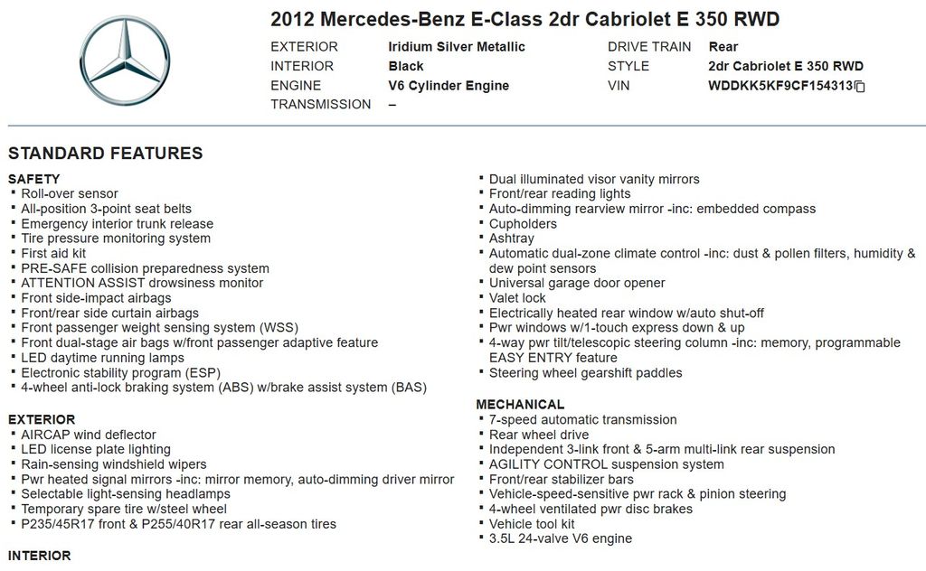 With its exceptional performance, luxurious amenities, and timeless style, this 2012 Mercedes-Benz E-Class E 350 Convertible is a true gem that is sure to captivate and impress. Don't miss your opportunity to experience the pinnacle of automotive excellence â" schedule a test drive today and discover the difference for yourself.