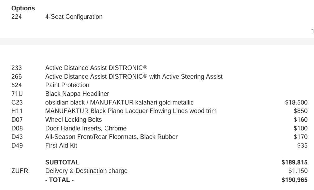 WHEELS: 22 X 9.5J FR & 22 X 11.5J RR MULTI-SPOKE, OBSIDIAN BLACK METALLIC, BLACK, EXCLUSIVE NAPPA LEATHER SEAT TRIM, MANUFAKTUR HIGH-GLOSS BLACK PIANO LACQUER TRIM, CHROME DOOR HANDLE INSERTS, ALL-SEASON FRONT & REAR FLOORMATS, FIRST AID KIT