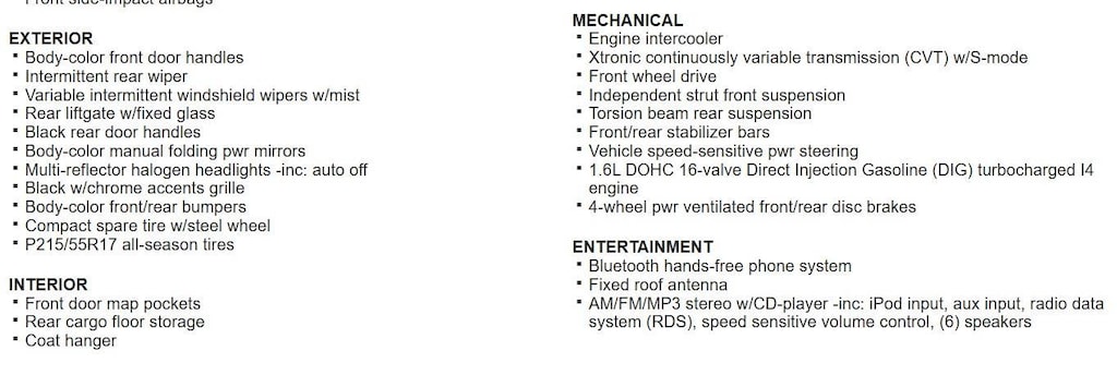 AM/FM/MP3 stereo w/CD-player -inc: iPod input, aux input, radio data system (RDS), speed sensitive volume control, (6) speakers, Trip computer -inc: tachometer, outside temp display, Vehicle security system, Pwr windows -inc: driver one-touch auto up/down