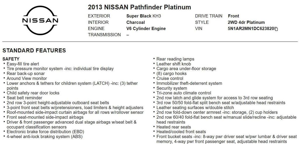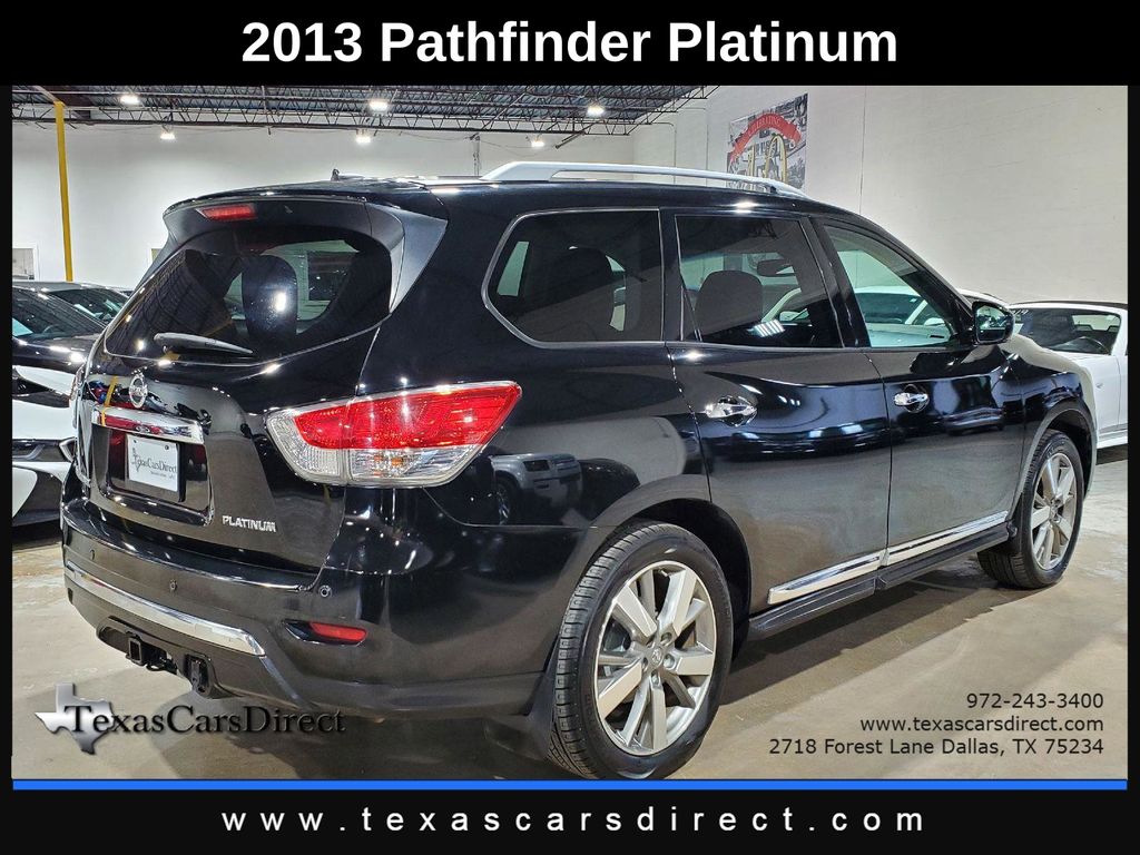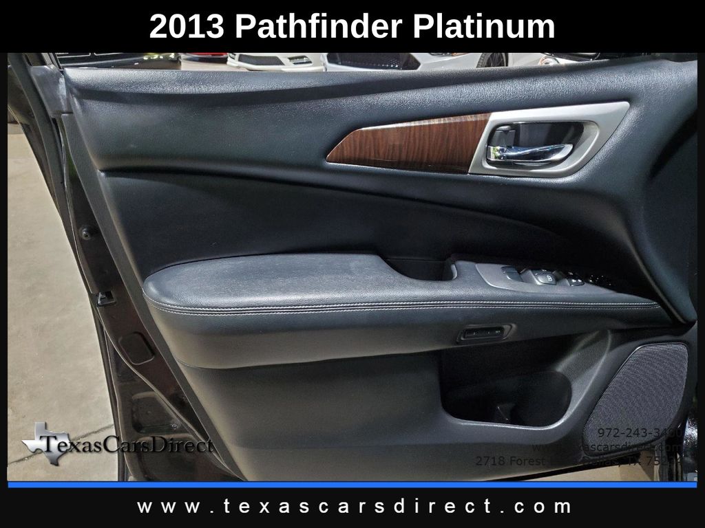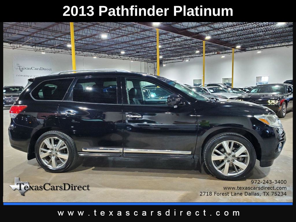 This 2013 Nissan Pathfinder Platinum, has Super Black exterior and Charcoal interior color. 120,941 miles. Stock Number 623820. You can connect with us by calling 972-243-3400.