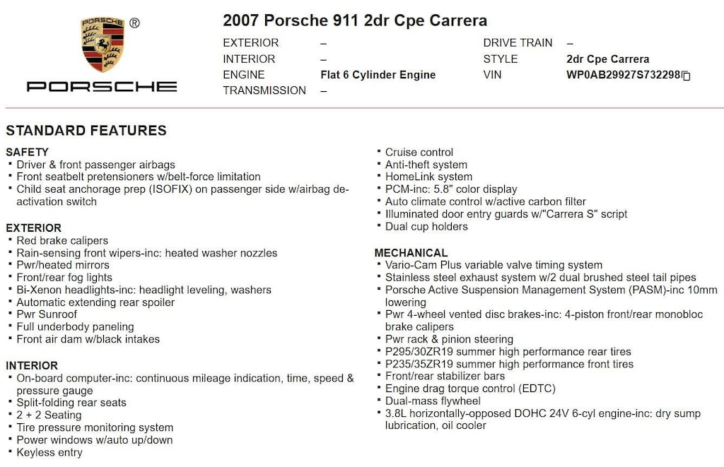 All wheel drive-inc: Porsche Traction Management (PTM), Pwr sunroof, Automatic extending rear spoiler, Bi-Xenon headlights-inc: headlight leveling, washers, Power windows w/auto up/down, Keyless Entry, Cruise Control, Homelink System, Auto climate control w/active carbon filter, Driver & front passenger airbags