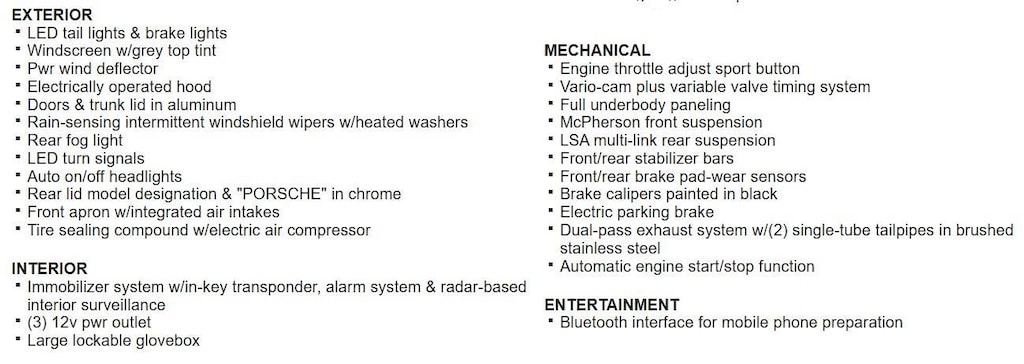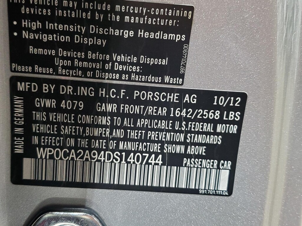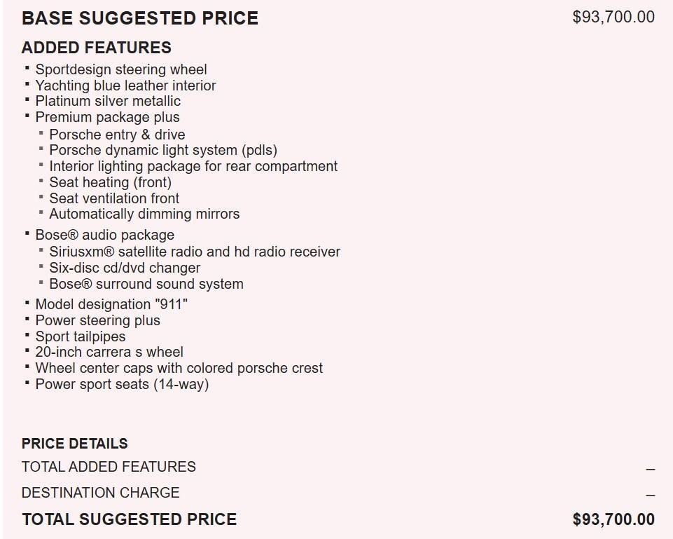 7-SPEED MANUAL TRANSMISSION, 20 X 8.5 FRONT/20 X 11 REAR CARRERA S ALUMINUM WHEELS, PREMIUM PKG PLUS W/14-WAY SPORT PWR BUCKET SEATS, WHEEL CAPS W/COLORED CREST, BOSE AUDIO PKG
