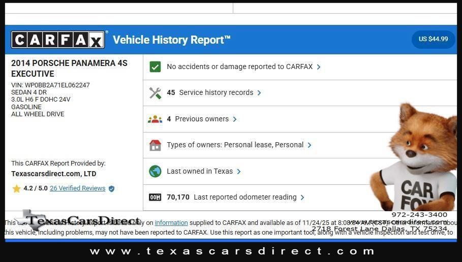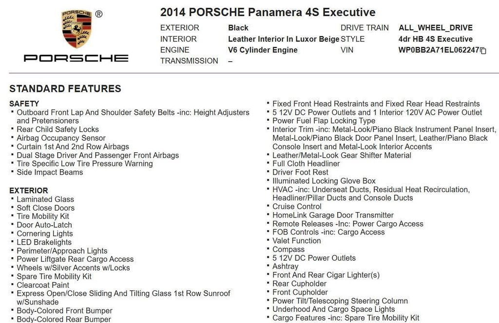 This 2014 Porsche Panamera 4S Executive, has Black exterior and Luxor Beige interior color. 70,403 miles. Stock Number 062247. You can connect with us by calling 972-243-3400.