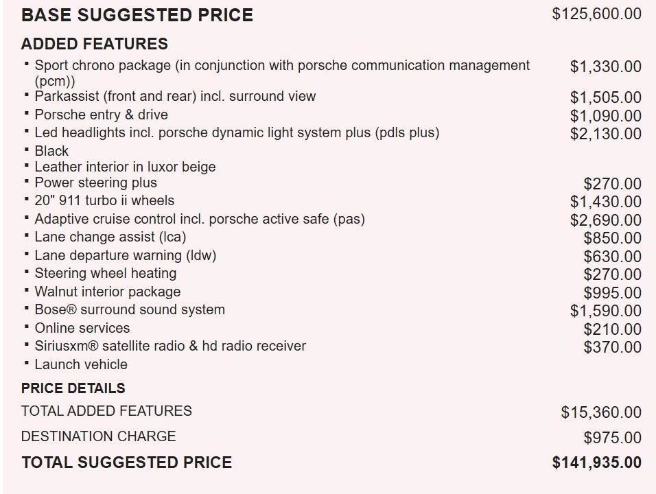 WHEELS: 9.5J X 20" FR & 11J X 20" RR 911 TURBO II, POWER STEERING PLUS, LED HEADLIGHTS W/PORSCHE DYNAMIC LIGHT SYSTEM PLUS, BOSE SURROUND SOUND-SYSTEM, PORSCHE ENTRY & DRIVE, SPORT CHRONO PACKAGE, ADAPTIVE CRUISE CONTROL W/PORSCHE ACTIVE SAFE, BURR WALNUT INTERIOR PACKAGE, LANE CHANGE ASSIST (LCA), LANE DEPARTURE WARNING (LDW), ONLINE SERVICES, REVERSING CAMERA W/FRONT & REAR PARKASSIST
