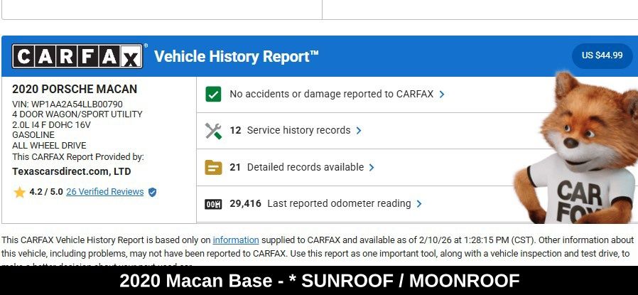 Meticulously cared for and with a clean CARFAX report, this 2020 Porsche Macan is a true gem. Priced at $35,798, it represents an exceptional value in the luxury SUV market. We invite you to experience the thrill of Porsche ownership and schedule a test drive today.