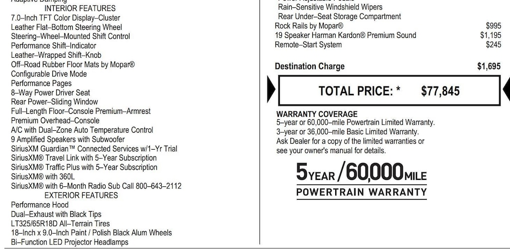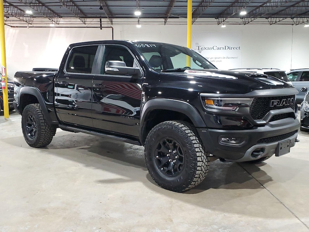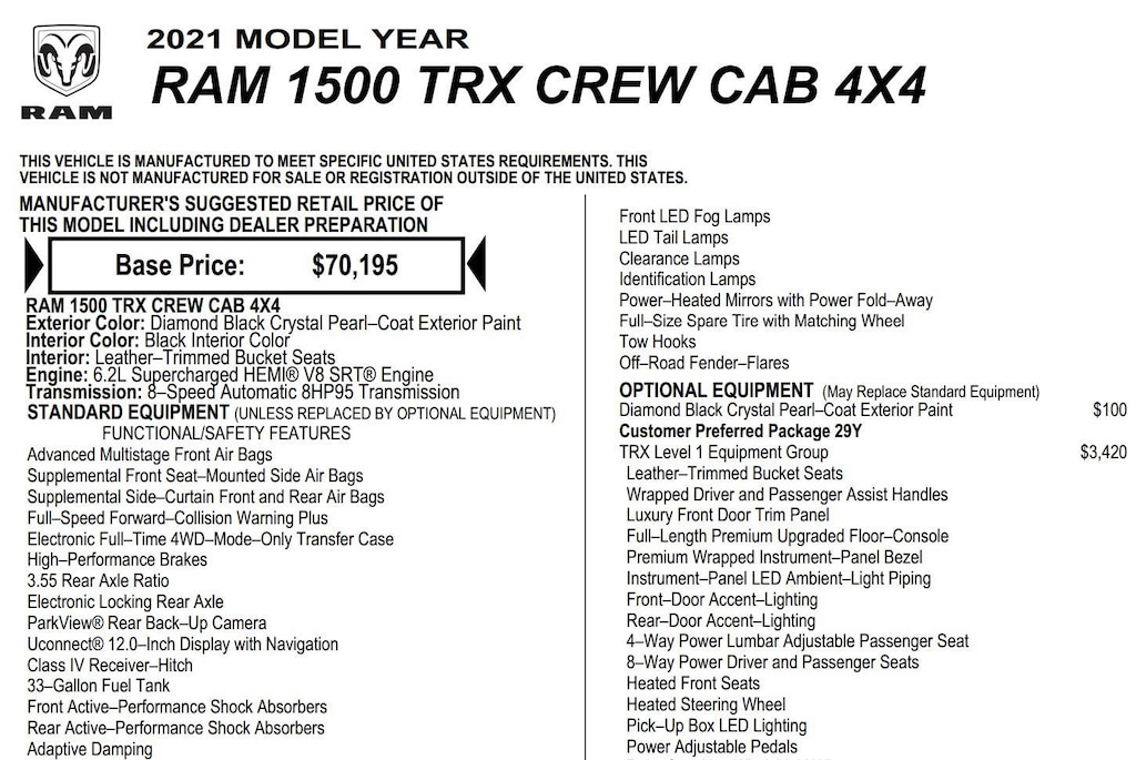 ENGINE: 6.2L SUPERCHARGED HEMI V8 SRT, TRANSMISSION: 8-SPEED AUTOMATIC (8HP95), QUICK ORDER PACKAGE 29Y, WHEELS: 18 X 9 BLACK PAINT/POLISH ALUMINUM, MONOTONE PAINT, DIAMOND BLACK CRYSTAL PEARLCOAT, DIAMOND BLACK CRYSTAL PEARLCOAT, BLACK, LEATHER TRIMMED BUCKET SEATS, TRX LEVEL 1 EQUIPMENT GROUP, MOPAR ROCK RAILS, FRONT LICENSE PLATE BRACKET, HARMAN/KARDON 19 SPEAKER PREMIUM SOUND, REMOTE START SYSTEM