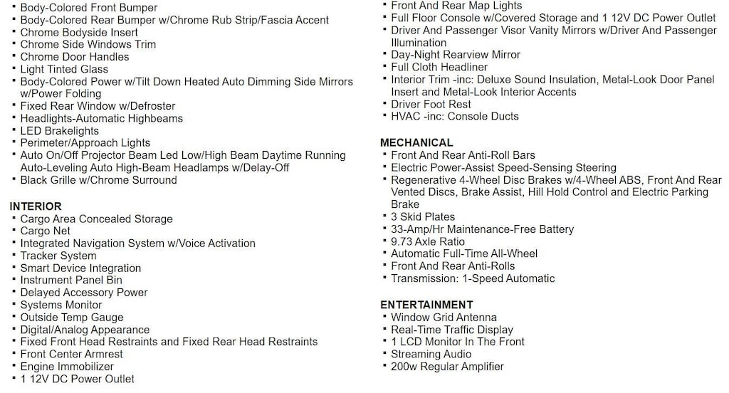 Lithium Ion (li-Ion) Traction Battery w/11.5 kW Onboard Charger, 79.817 Hrs Charge Time @ 110/120V, 12 Hrs Charge Time @ 220/240V and 75 kWh Capacity, Streaming Audio, Real-Time Traffic Display, Full Service Internet Access, HomeLink Garage Door Transmitter, Smart Device Integration, Blind Spot